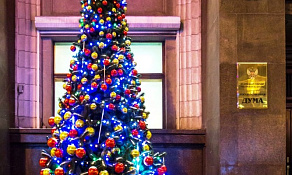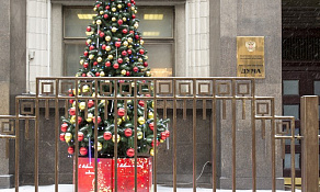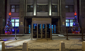 Элементы: 2 небольшие ёлки у входа, высотой 5 метров, оформленные желтыми и красными шарами и гирляндами цветной каскад.