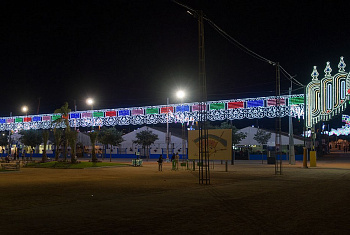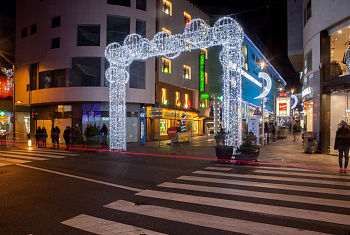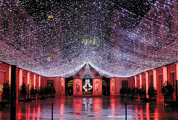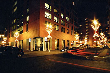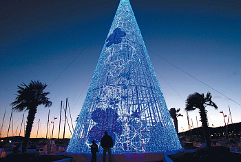 Элементы: 2 небольшие ёлки у входа, высотой 5 метров, оформленные желтыми и красными шарами и гирляндами цветной каскад.
